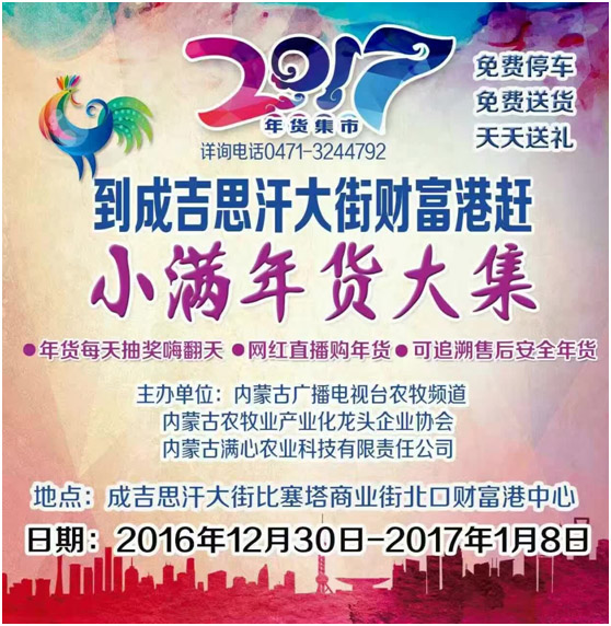 1230日,經(jīng)過(guò)精心籌備策劃的內(nèi)蒙古廣播電視臺(tái)農(nóng)牧頻道小滿(mǎn)年貨大集終于精彩亮相青城與廣大市民群眾見(jiàn)面了。年貨大集現(xiàn)場(chǎng),140家參展企業(yè)上千種產(chǎn)品競(jìng)相亮相,本次活動(dòng)由內(nèi)蒙古農(nóng)牧業(yè)產(chǎn)業(yè)化龍頭企業(yè)協(xié)會(huì)攜手內(nèi)蒙古廣播電視臺(tái)農(nóng)牧頻道和內(nèi)蒙古滿(mǎn)心農(nóng)業(yè)科技有限責(zé)任公司共同打造,搭建一個(gè)展示企業(yè)形象、宣傳地方產(chǎn)品、溝通產(chǎn)銷(xiāo)渠道、擴(kuò)大消費(fèi)需求、活躍節(jié)日市場(chǎng)的經(jīng)濟(jì)平臺(tái),營(yíng)造溫馨舒適、品種齊全、質(zhì)優(yōu)價(jià)廉、安全可靠、熱鬧紅火的節(jié)日購(gòu)物氛圍,讓全區(qū)老百姓不用東奔西走就能購(gòu)買(mǎi)到內(nèi)蒙古的新鮮蔬菜、瓜果、乳肉、糧油等特色農(nóng)畜產(chǎn)品,采購(gòu)到豐富的鄉(xiāng)土年貨、進(jìn)口食品、日用副食等,豐富首府百姓的菜籃子。