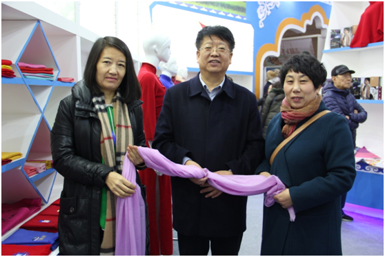 農(nóng)牧業(yè)廳產(chǎn)業(yè)化處處長侯雁冰、副處長郟金梅參觀羊絨展區(qū)