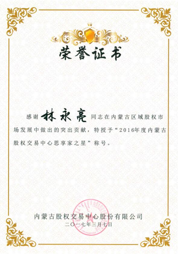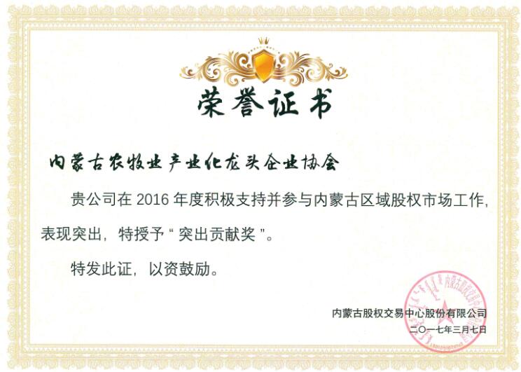 在37日上午召開的首屆內(nèi)蒙古股權(quán)交易中心會(huì)員和分支機(jī)構(gòu)大會(huì)上,內(nèi)蒙古農(nóng)牧業(yè)產(chǎn)業(yè)化龍頭企業(yè)協(xié)會(huì)因積極支持并參與內(nèi)蒙古區(qū)域股權(quán)市場工作,榮獲內(nèi)蒙古股權(quán)交易中心頒發(fā)的“突出貢獻(xiàn)獎(jiǎng)”,協(xié)會(huì)執(zhí)行會(huì)長兼秘書長林永亮及常務(wù)秘書長劉俊青均榮獲“內(nèi)蒙古股權(quán)交易中心思享家之星”稱號(hào)。這是對協(xié)會(huì)在2016年對內(nèi)蒙古區(qū)域股權(quán)市場發(fā)展中突出貢獻(xiàn)的肯定,更是承載著一份責(zé)任和希望,新的一年,內(nèi)蒙古農(nóng)牧業(yè)產(chǎn)業(yè)化龍頭企業(yè)協(xié)會(huì)將繼續(xù)秉承“溝通 服務(wù) 自律 發(fā)展”的服務(wù)宗旨,乘勢而上,加壓奮進(jìn),開拓創(chuàng)新,找準(zhǔn)協(xié)會(huì)工作與股權(quán)經(jīng)濟(jì)建設(shè)的結(jié)合點(diǎn),為推動(dòng)農(nóng)牧業(yè)產(chǎn)業(yè)化發(fā)展做出新的貢獻(xiàn)。