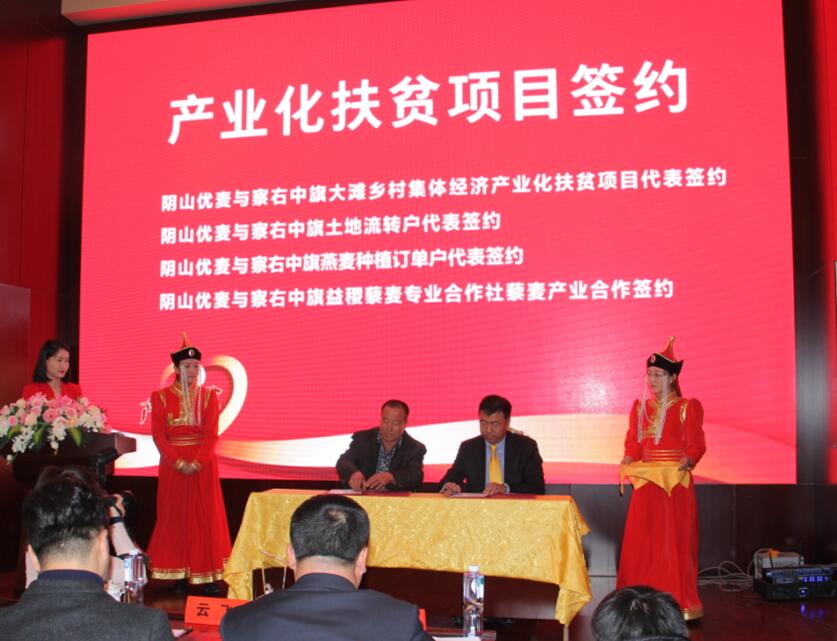 會(huì)議期間,內(nèi)蒙古陰山優(yōu)麥?zhǔn)称酚邢薰具€分別與察右中旗大灘鄉(xiāng)集體經(jīng)濟(jì)產(chǎn)業(yè)化扶貧項(xiàng)目代表、察右中旗土地流轉(zhuǎn)戶代表、察右中旗燕麥種植訂單戶代表和察右中旗易稷藜麥專業(yè)合作社進(jìn)行了現(xiàn)場(chǎng)簽約。