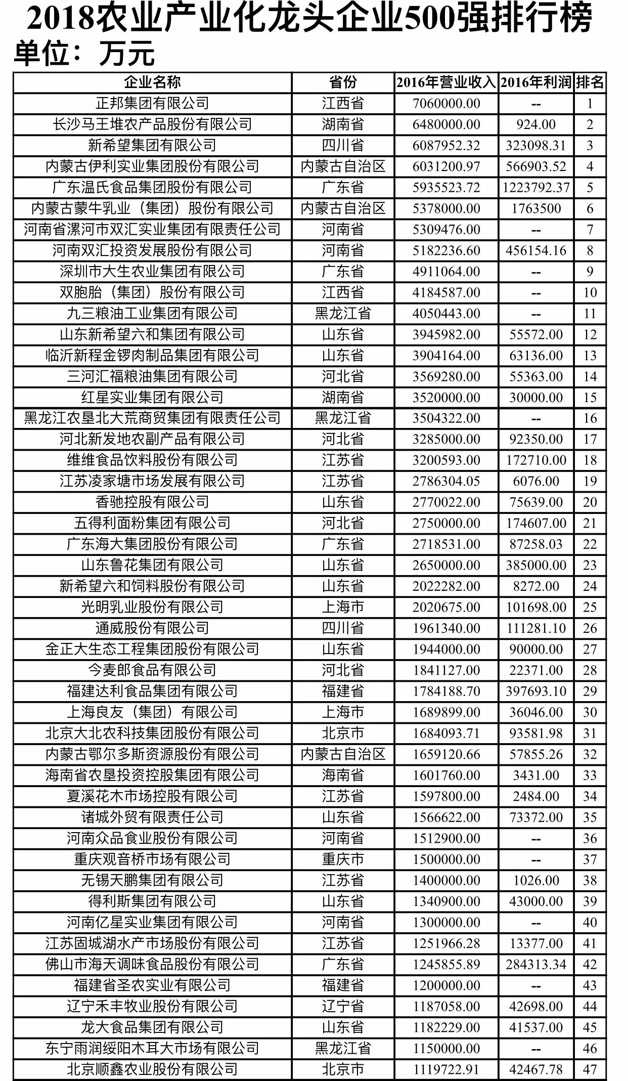 新型農(nóng)業(yè)經(jīng)營主體是發(fā)展現(xiàn)代農(nóng)業(yè)和實現(xiàn)鄉(xiāng)村振興的重要力量。為全面了解各類新型農(nóng)業(yè)經(jīng)營主體的發(fā)展情況,在相關(guān)主管部門和各省區(qū)市的大力支持下,農(nóng)民日報社組織權(quán)威專家開展課題研究,并采集和梳理大量數(shù)據(jù),依據(jù)2016年營業(yè)收入進(jìn)行排名,入圍門檻為6.11億元,綜合形成了《2018農(nóng)業(yè)產(chǎn)業(yè)化龍頭企業(yè)500強(qiáng)排行榜》。