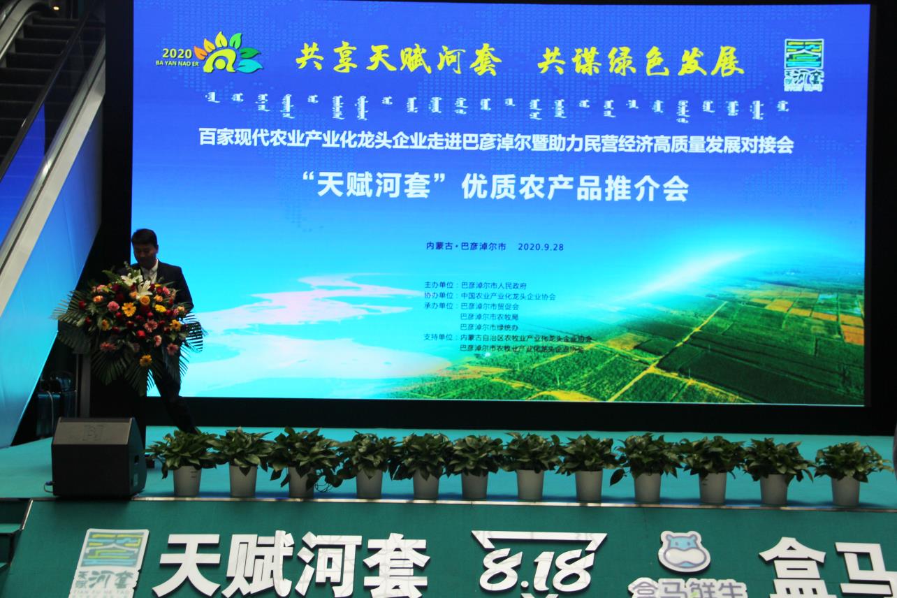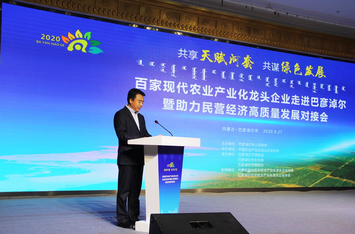 9月27日,由巴彥淖爾市人民政府主辦,中國農(nóng)業(yè)產(chǎn)業(yè)化龍頭企業(yè)協(xié)會(huì)協(xié)辦,巴彥淖爾市貿(mào)促會(huì)、巴彥淖爾市農(nóng)牧局、巴彥淖爾市綠統(tǒng)辦承辦,內(nèi)蒙古農(nóng)牧業(yè)產(chǎn)業(yè)化龍頭企業(yè)協(xié)會(huì)、巴彥淖爾市農(nóng)牧業(yè)產(chǎn)業(yè)化龍頭企業(yè)協(xié)會(huì)支持,以“共享‘天賦河套’·共謀綠色發(fā)展”為主題的百家現(xiàn)代農(nóng)業(yè)產(chǎn)業(yè)化龍頭企業(yè)走進(jìn)巴彥淖爾暨助力民營經(jīng)濟(jì)高質(zhì)量發(fā)展對(duì)接會(huì)在巴彥淖爾市臨河區(qū)召開。中國農(nóng)業(yè)產(chǎn)業(yè)化龍頭企業(yè)協(xié)會(huì)會(huì)長劉身利,中國農(nóng)科院紀(jì)檢組組長史志國,內(nèi)蒙古自治區(qū)黨委巡視二組駐巴彥淖爾市優(yōu)化營商環(huán)境專項(xiàng)工作組副組長董躍飛,巴彥淖爾市委副書記、市長張曉兵,市人大常委會(huì)主任閆鵬,市委副書記、政法委書記李中增,市委常委孫艾芳、王志平出席會(huì)議,副市長任逸群作市情推介,內(nèi)蒙古農(nóng)牧業(yè)產(chǎn)業(yè)化龍頭企業(yè)協(xié)會(huì)會(huì)長周勇應(yīng)邀出席會(huì)議。