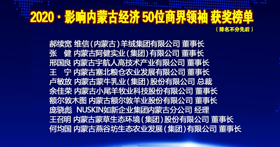 年會上內(nèi)蒙古金融網(wǎng)、內(nèi)蒙古新金融研究院隆重推出2020•影響內(nèi)蒙古經(jīng)濟(jì)50位商界領(lǐng)袖榜單,從2015年度開始,每年按照項目發(fā)展,甄選出當(dāng)年度引領(lǐng)商界風(fēng)潮的50位內(nèi)蒙古最具影響力的商界領(lǐng)袖。