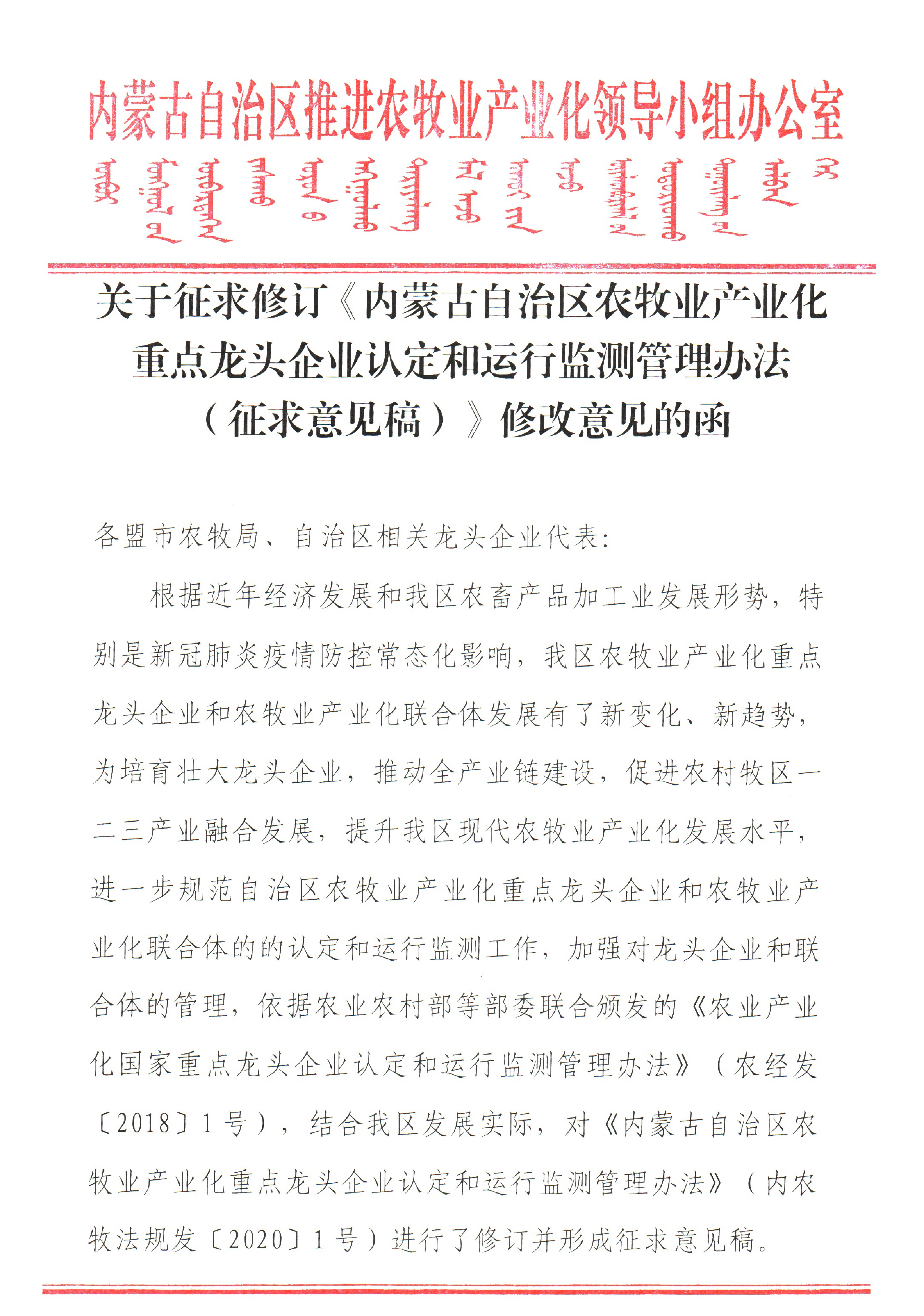 標題:關于征求修訂《內(nèi)蒙古自治區(qū)農(nóng)牧業(yè)產(chǎn)業(yè)化重點龍頭企業(yè)認定和運行監(jiān)測管理辦法(征求意見稿)》修改意見的函