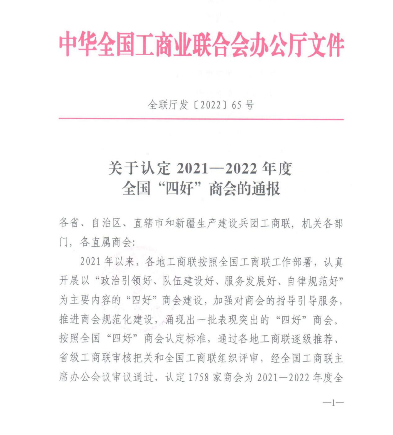 近日,中華全國工商業(yè)聯(lián)合會(huì)辦公廳發(fā)布《關(guān)于認(rèn)定20212022年度全國“四好”商會(huì)的通報(bào)》,通報(bào)指出,按照全國“四好”商會(huì)認(rèn)定標(biāo)準(zhǔn),在各地工商聯(lián)逐級(jí)推薦、省級(jí)工商聯(lián)審核把關(guān)、全國工商聯(lián)組織評(píng)審的基礎(chǔ)上,經(jīng)全國工商聯(lián)主席辦公會(huì)議審議通過,評(píng)選出2021-2022年度全國“四好”商會(huì)。內(nèi)蒙古農(nóng)牧業(yè)產(chǎn)業(yè)化龍頭企業(yè)協(xié)會(huì)等42家商(協(xié))會(huì)榮獲2021-2022年度全國“四好”商會(huì)榮譽(yù)稱號(hào)!