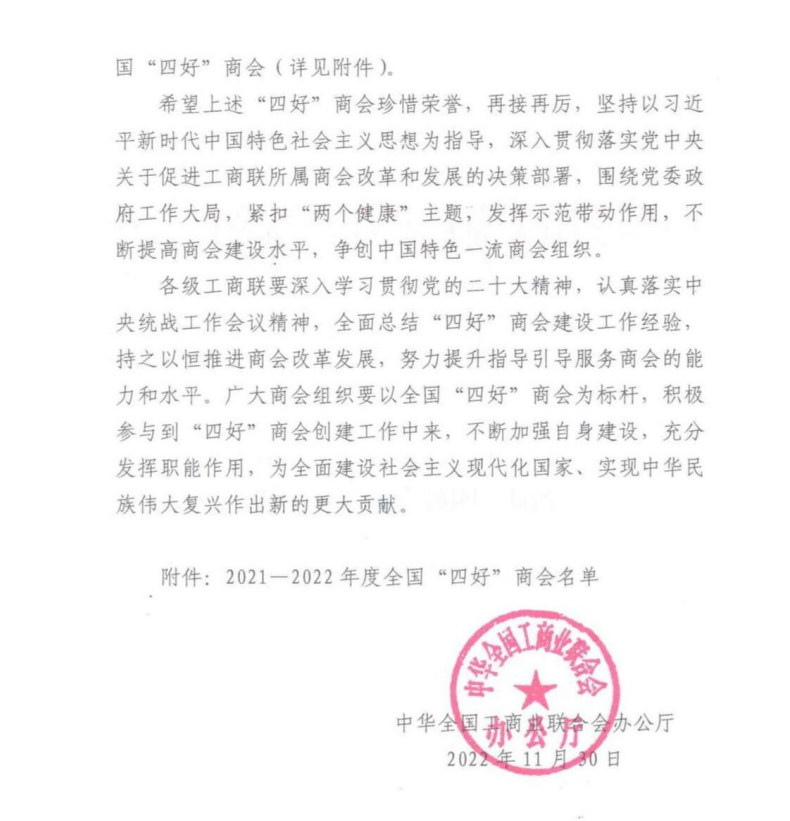 再次榮獲全國“四好”商會(huì)榮譽(yù)稱號(hào)