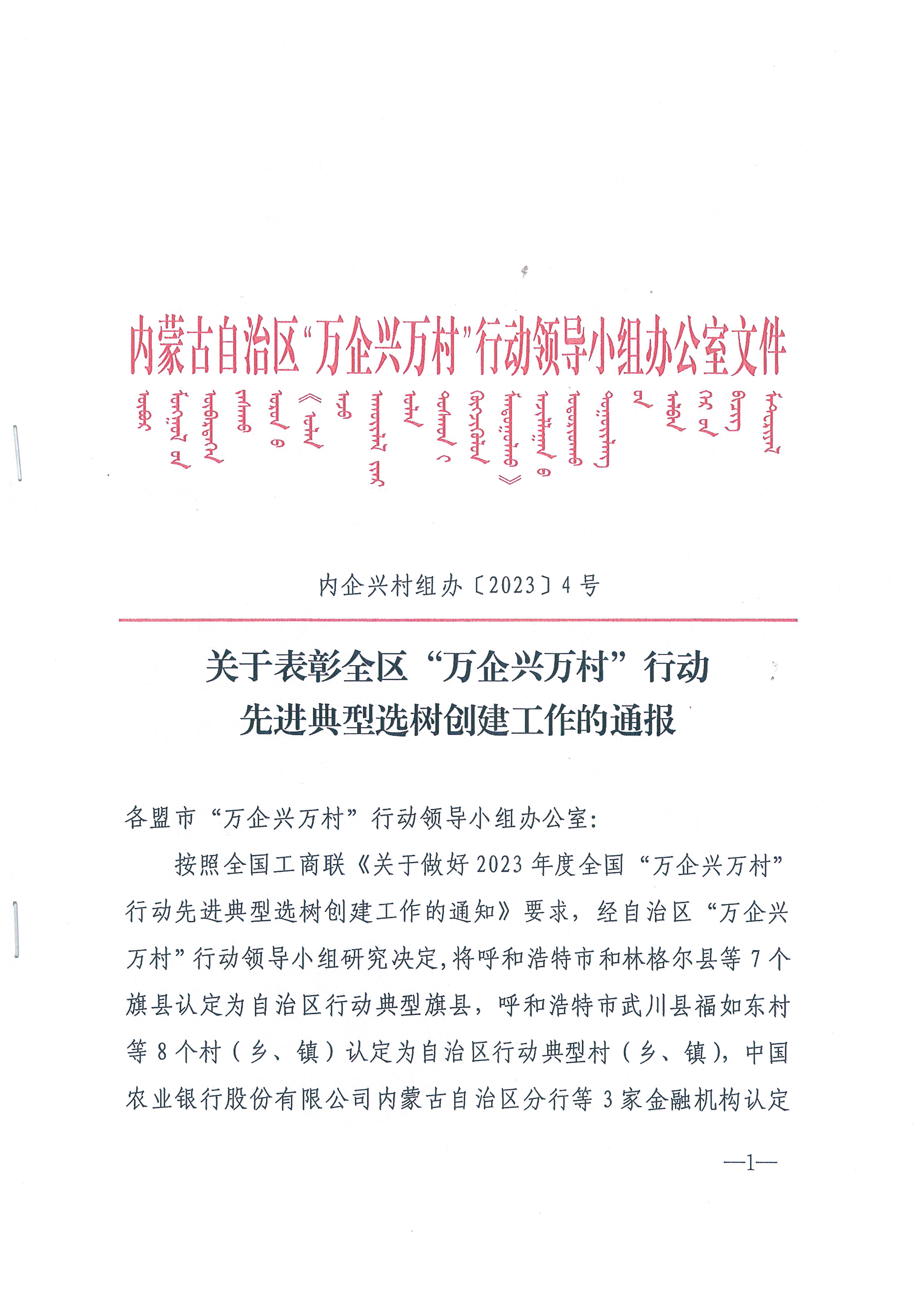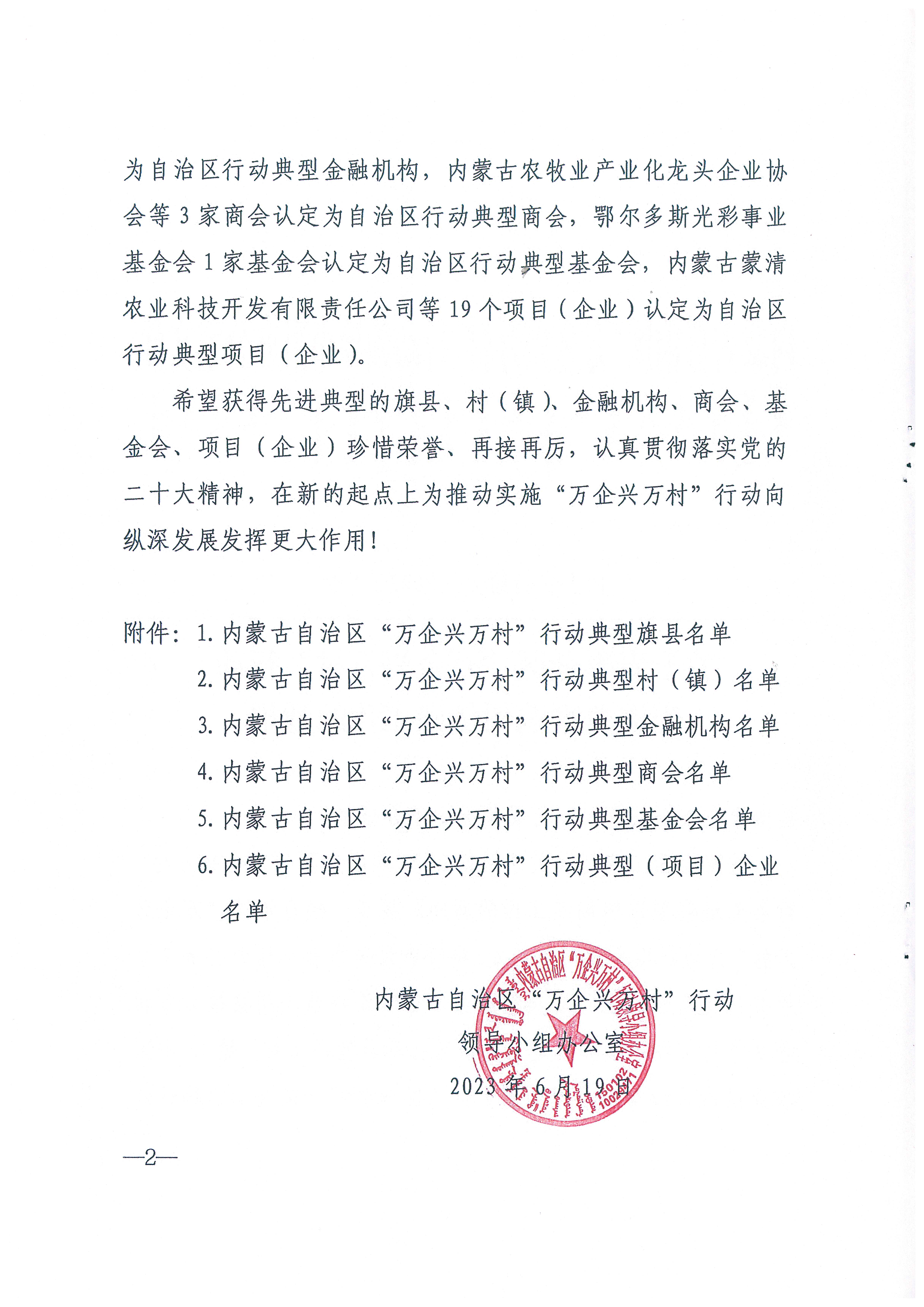 按照全國工商聯(lián)《關(guān)于做好 2023 年度全國“萬企興萬村行動先進(jìn)典型選樹創(chuàng)建工作的通知》要求,經(jīng)自治區(qū)“萬企興萬村”行動領(lǐng)導(dǎo)小組研究決定,將呼和浩特市和林格爾縣等 7個旗縣認(rèn)定為自治區(qū)行動典型旗縣,呼和浩特市武川縣福如東村等8個村(鄉(xiāng)、鎮(zhèn))認(rèn)定為自治區(qū)行動典型村 (鄉(xiāng)、鎮(zhèn)),中國農(nóng)業(yè)銀行股份有限公司內(nèi)蒙古自治區(qū)分行等 3 家金融機(jī)構(gòu)認(rèn)定為自治區(qū)行動典型金融機(jī)構(gòu),內(nèi)蒙古農(nóng)牧業(yè)產(chǎn)業(yè)化龍頭企業(yè)協(xié)會等 3 家商會認(rèn)定為自治區(qū)行動典型商會,鄂爾多斯光彩事業(yè)基金會 1家基金會認(rèn)定為自治區(qū)行動典型基金會,內(nèi)蒙古蒙清農(nóng)業(yè)科技開發(fā)有限責(zé)任公司等 19 個項目(企業(yè))認(rèn)定為自治區(qū)行動典型項目(企業(yè))