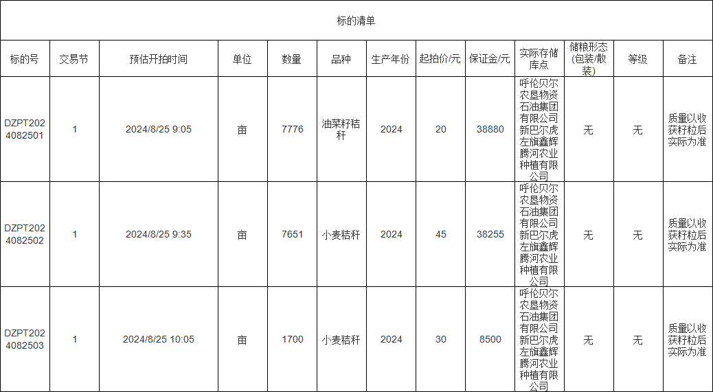 轉讓標的為油菜籽秸稈、小麥秸稈、小麥秸稈,涉及面積油菜籽秸稈7776畝、小麥秸稈7651畝、小麥秸稈1700畝,意向受讓方在競買前應自行對標的預估數(shù)量和質量情況進行充分了解,交易標的均以實際狀況為準。標的存放地位于呼倫貝爾農墾物資石油集團有限公司新巴爾虎左旗鑫輝騰河農業(yè)種植有限公司,詳情見標的清單: