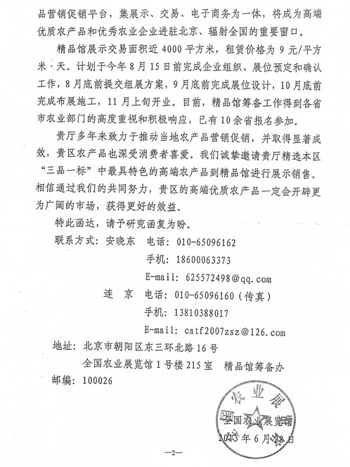 關(guān)于邀請(qǐng)參加全國優(yōu)質(zhì)農(nóng)產(chǎn)品精品館展示銷售的函