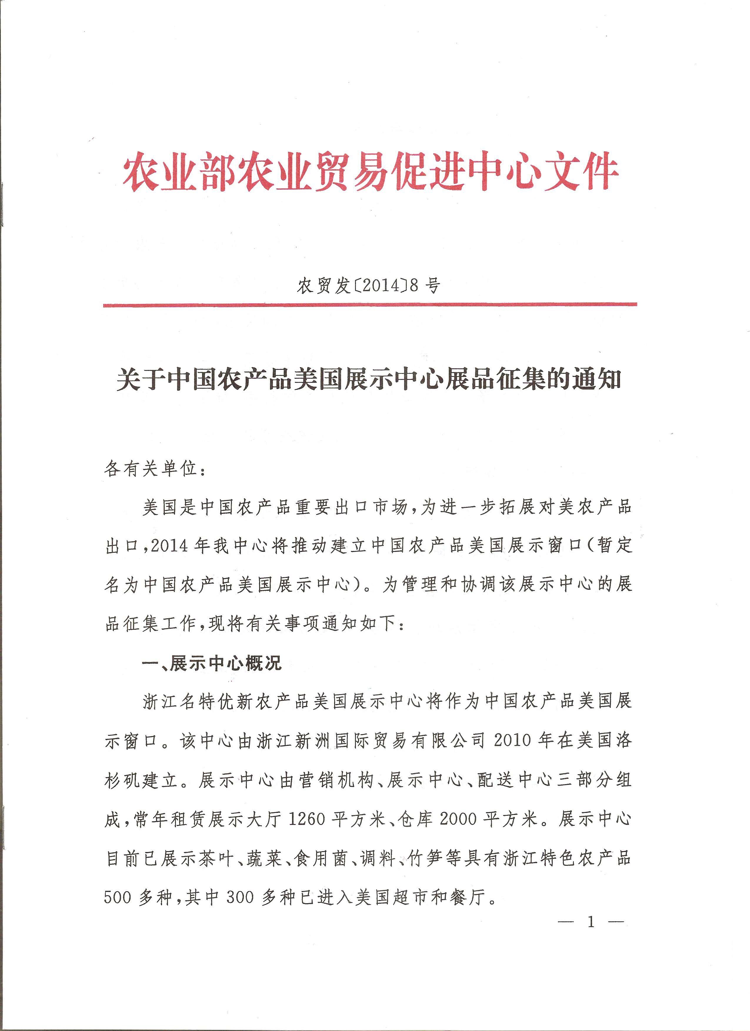 關(guān)于中國(guó)農(nóng)產(chǎn)品美國(guó)展示中心展品征集的通知
