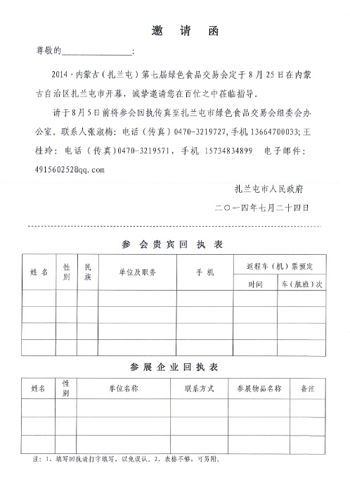 2014·內(nèi)蒙古(扎蘭屯)第七屆綠色食品交易會邀請函