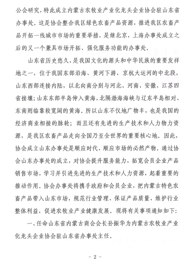 關(guān)于成立內(nèi)蒙古農(nóng)牧業(yè)產(chǎn)業(yè)化龍頭企業(yè)協(xié)會駐山東辦事處的通知