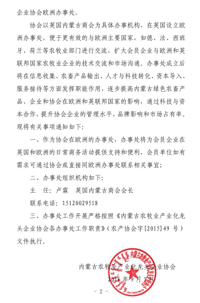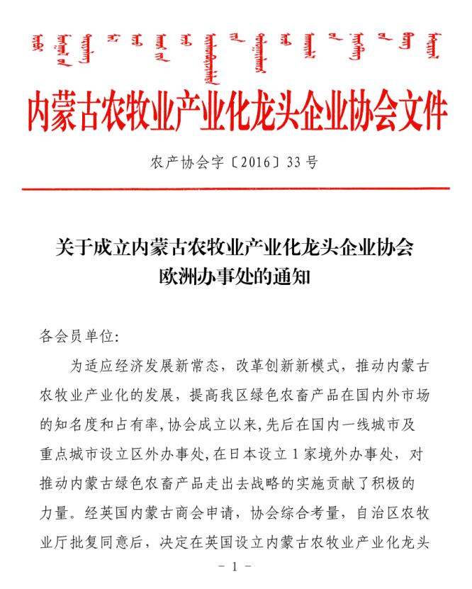 關(guān)于成立內(nèi)蒙古農(nóng)牧業(yè)產(chǎn)業(yè)化龍頭企業(yè)協(xié)會(huì)歐洲辦事處的通知