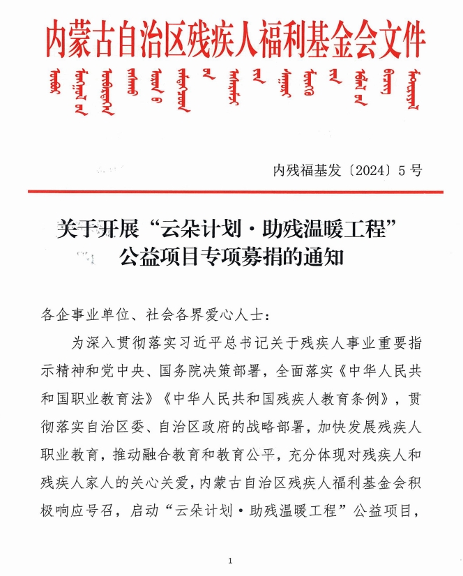 關(guān)于開展“云朵計劃·助殘溫暖工程’公益項(xiàng)目專項(xiàng)募捐的通知