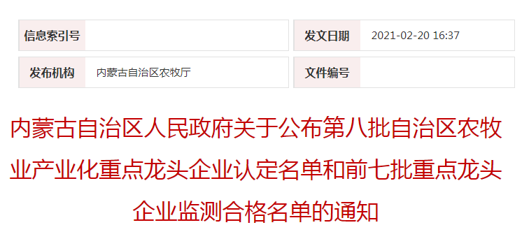 企業(yè)名稱:內(nèi)蒙古自治區(qū)人民政府關(guān)于公布第八批自治區(qū)農(nóng)牧業(yè)產(chǎn)業(yè)化重點(diǎn)龍頭企業(yè)認(rèn)定名單和前七批重點(diǎn)龍頭企業(yè)監(jiān)測(cè)合格名單的通知