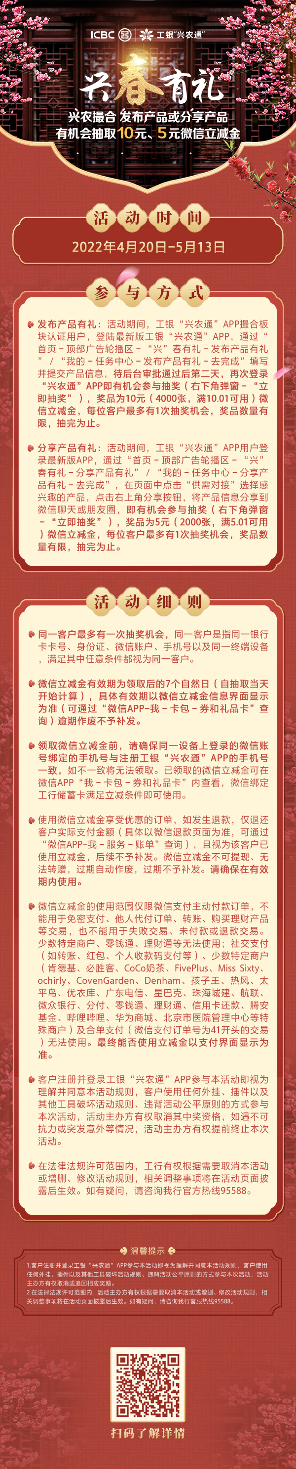 近期,“興農撮合”平臺正式入駐工銀“興農通”APP,還上線了“興”春有禮營銷活動。入駐平臺后,發(fā)布并分享產品,最高有機會獲得15元微信立減金!詳情可參考下方長圖: